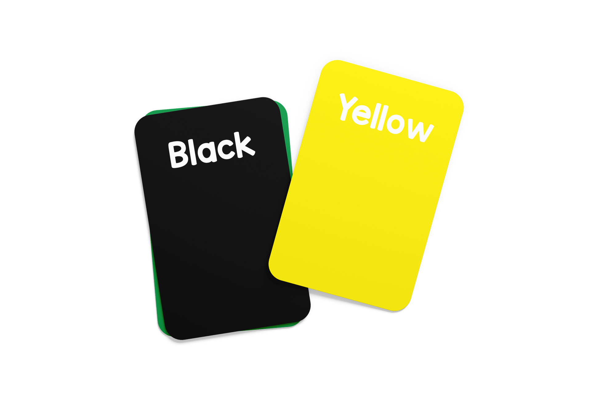 - الجانب 1: تحتوي على صورة لعنصر يتطابق مع لون البطاقة وثلاث كلمات ملونة أسفلها.